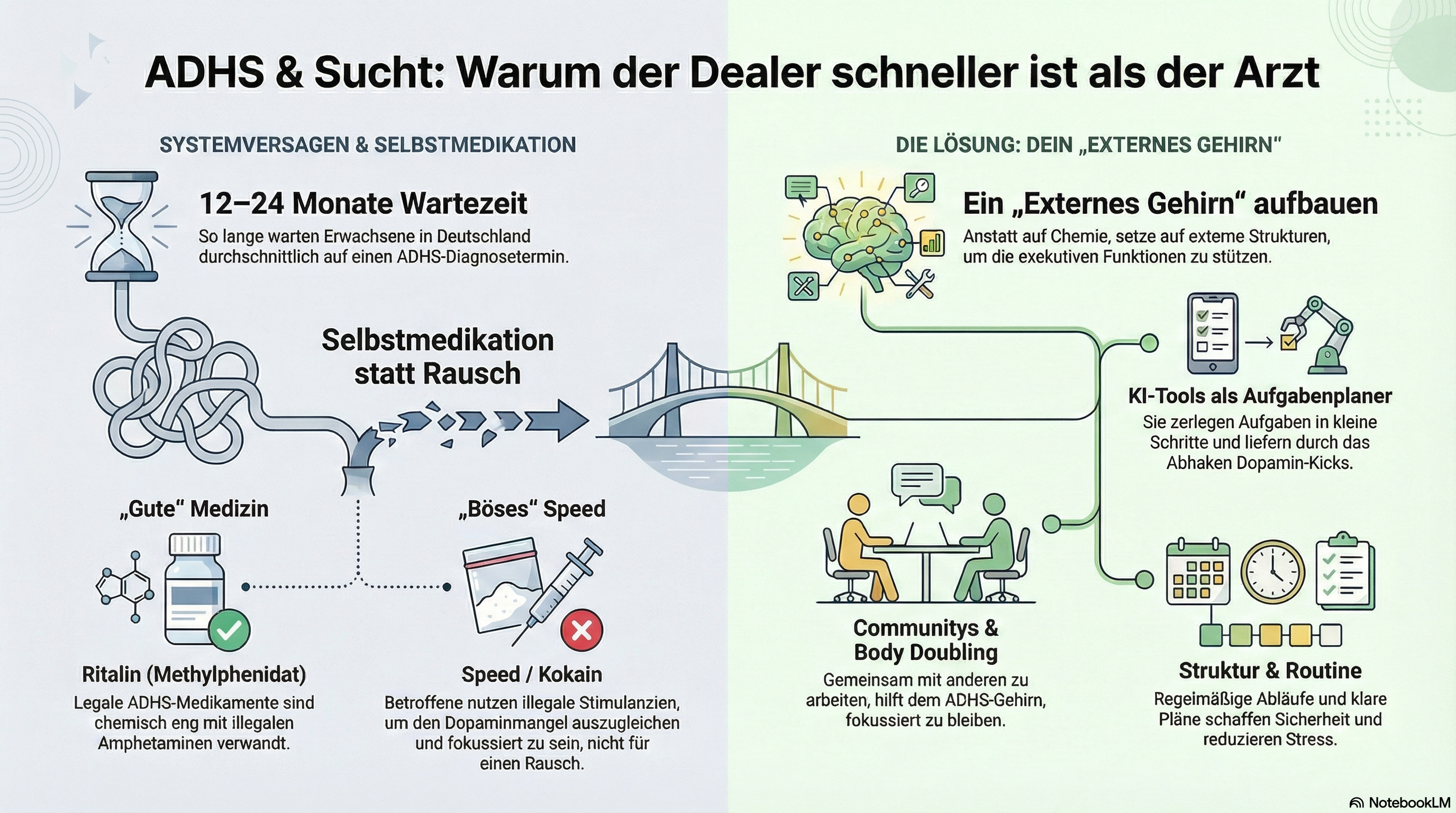 - Die Lösung: Solange das medizinische System versagt, brauchen Betroffene „externe Gehirne“ (Struktur-Tools, KI), um die Exekutivfunktionen zu stützen, statt sich chemisch zu betäuben.