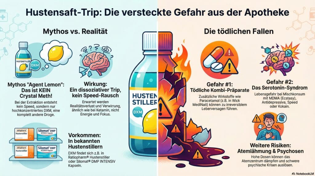 In der richtigen Dosis hilft er gegen nervigen Reizhusten. In missbräuchlich hohen Dosen wird er aber zu einer potenten dissoziativen Droge mit erheblichen und oft versteckten Risiken. Lass uns beleuchten, warum der Kick aus der Hustensaftflasche eine verdammt schlechte Idee ist.