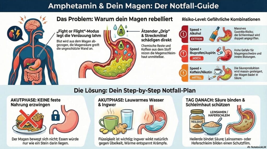 - [Der Grund]: Speed aktiviert „Fight or Flight“, stoppt die Verdauung und leitet Blut aus dem Magen ab. Säure greift die ungeschützte Wand an.