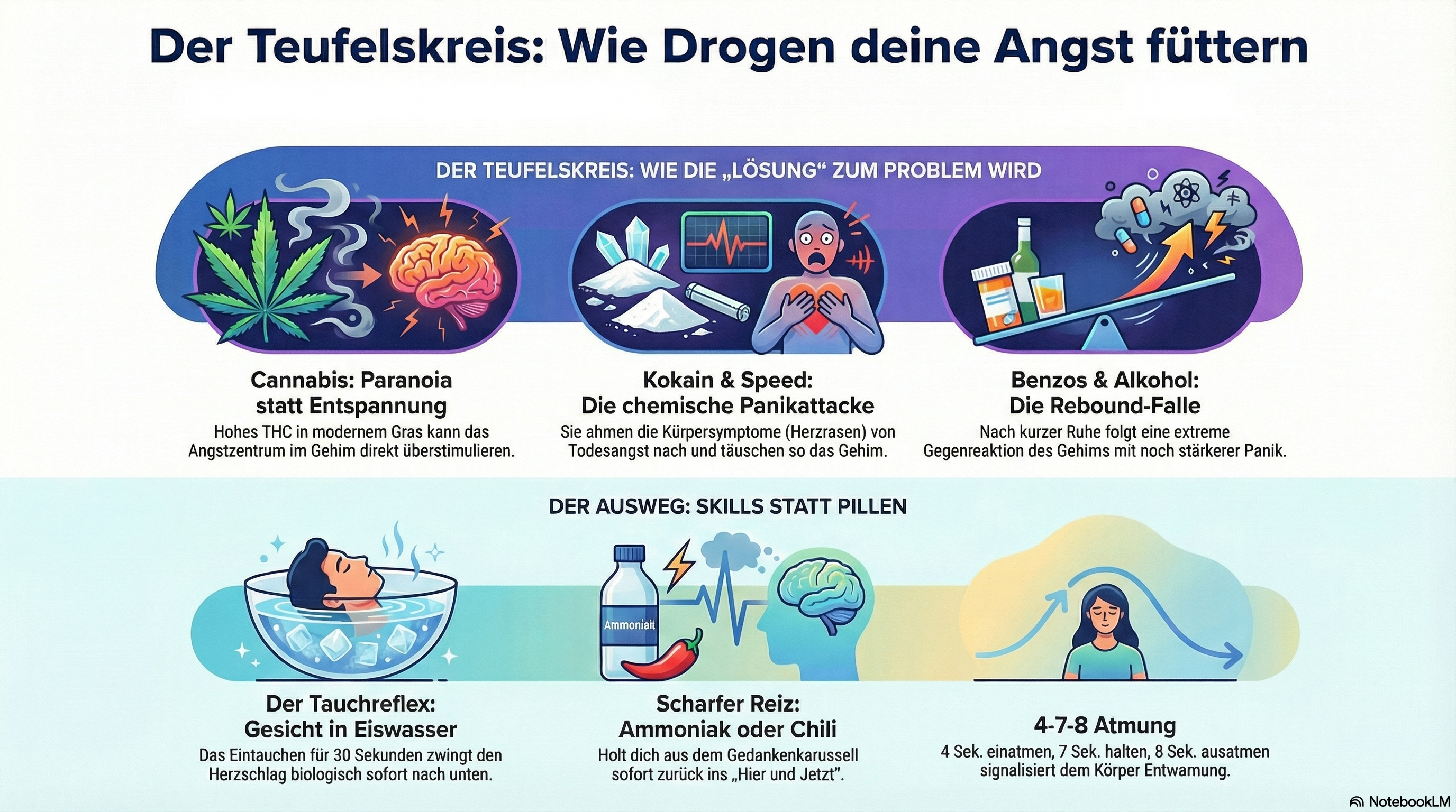 - Kokain & Speed: Sie fluten den Körper mit Noradrenalin. Das Herz rasen, die Hände zittern. Das sind exakt dieselben körperlichen Symptome wie bei einer Panikattacke. Dein Gehirn verwechselt die Drogenwirkung mit Todesangst.