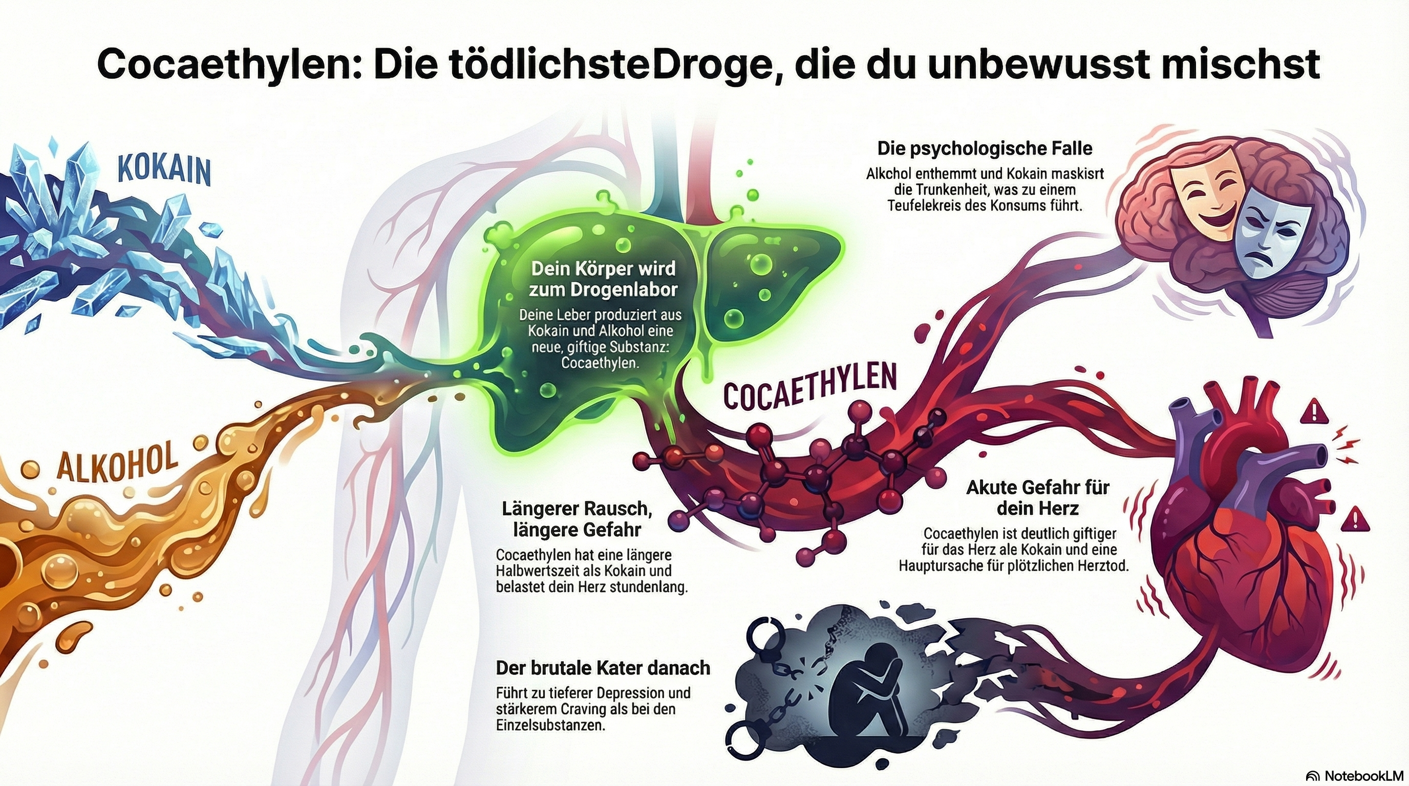 Die Kombination Kokain + Alkohol ist keine Addition, sondern die Produktion einer neuen Droge. Das Risiko für plötzlichen Herztod ist exponentiell höher. Der „Cocaethylen-Loop“ führt schnell in die Abhängigkeit.