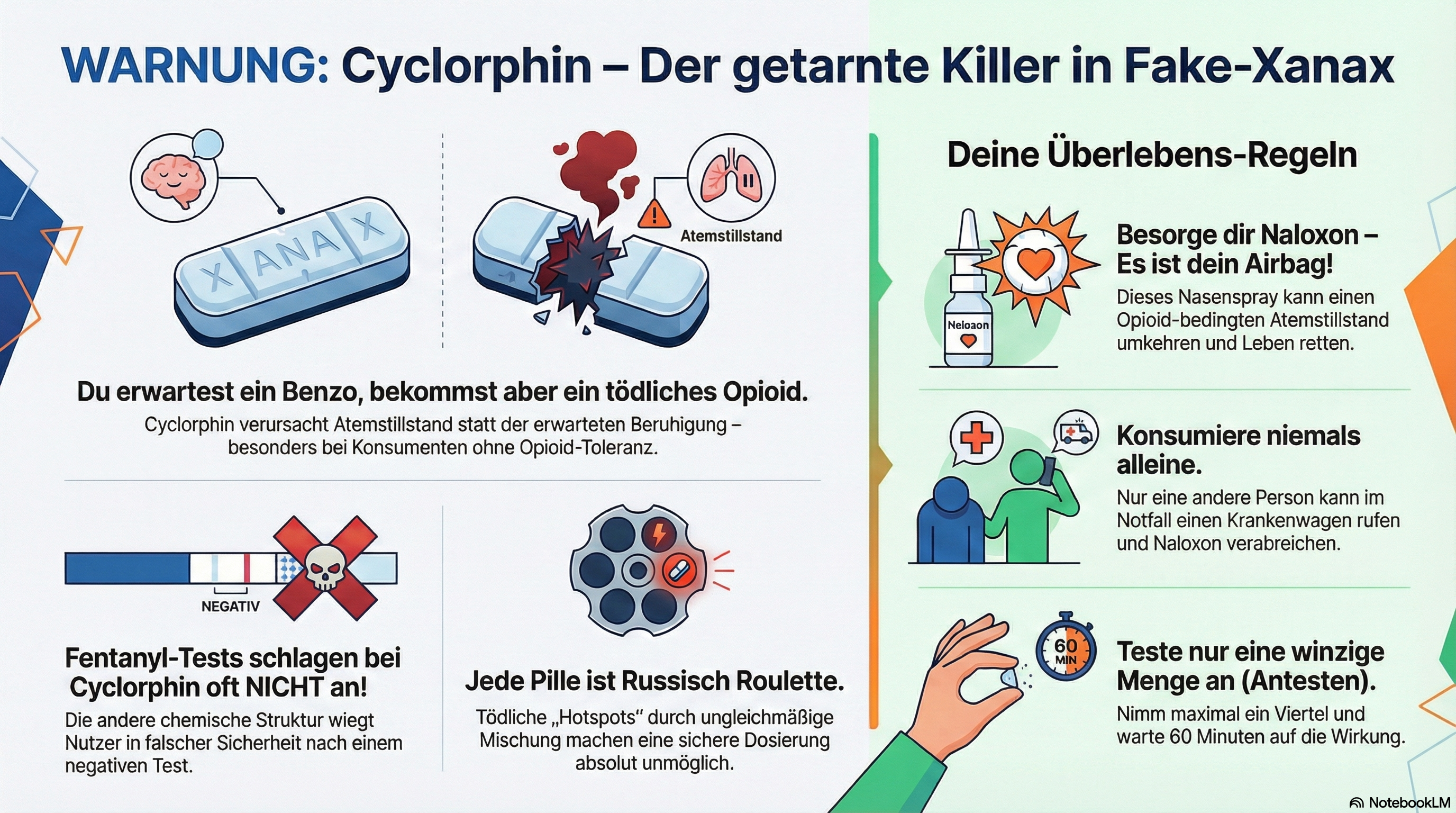 - [Tarnkappen-Killer]: Cyclorphin ist ein starkes Opioid, das in Deutschland (2025) in gefälschten Alprazolam-Tabletten („Xanax“) gefunden wurde.
