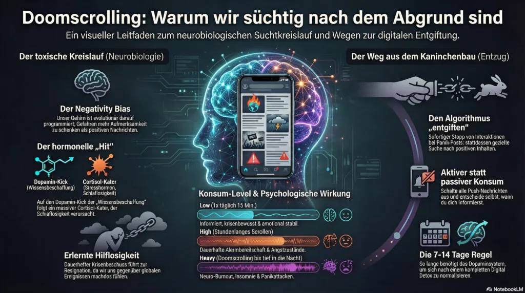 - [Neuro-Gefahr]: Dauerhafte Katastrophen-News überfluten das Gehirn mit Cortisol. Die Folge: Schlaflosigkeit, Panik und das lähmende Gefühl von „Erlernter Hilflosigkeit“.