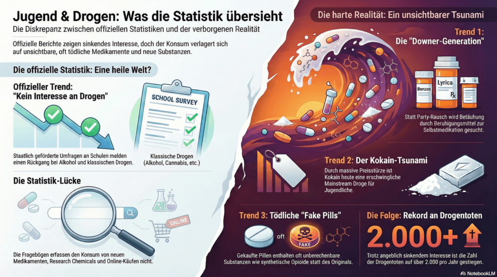 - [Statistik-Lücke]: Offizielle Umfragen basieren oft auf Ehrlichkeit in Schulen – Konsum von Medikamenten (Benzos) und RCs wird oft verschwiegen oder nicht abgefragt.