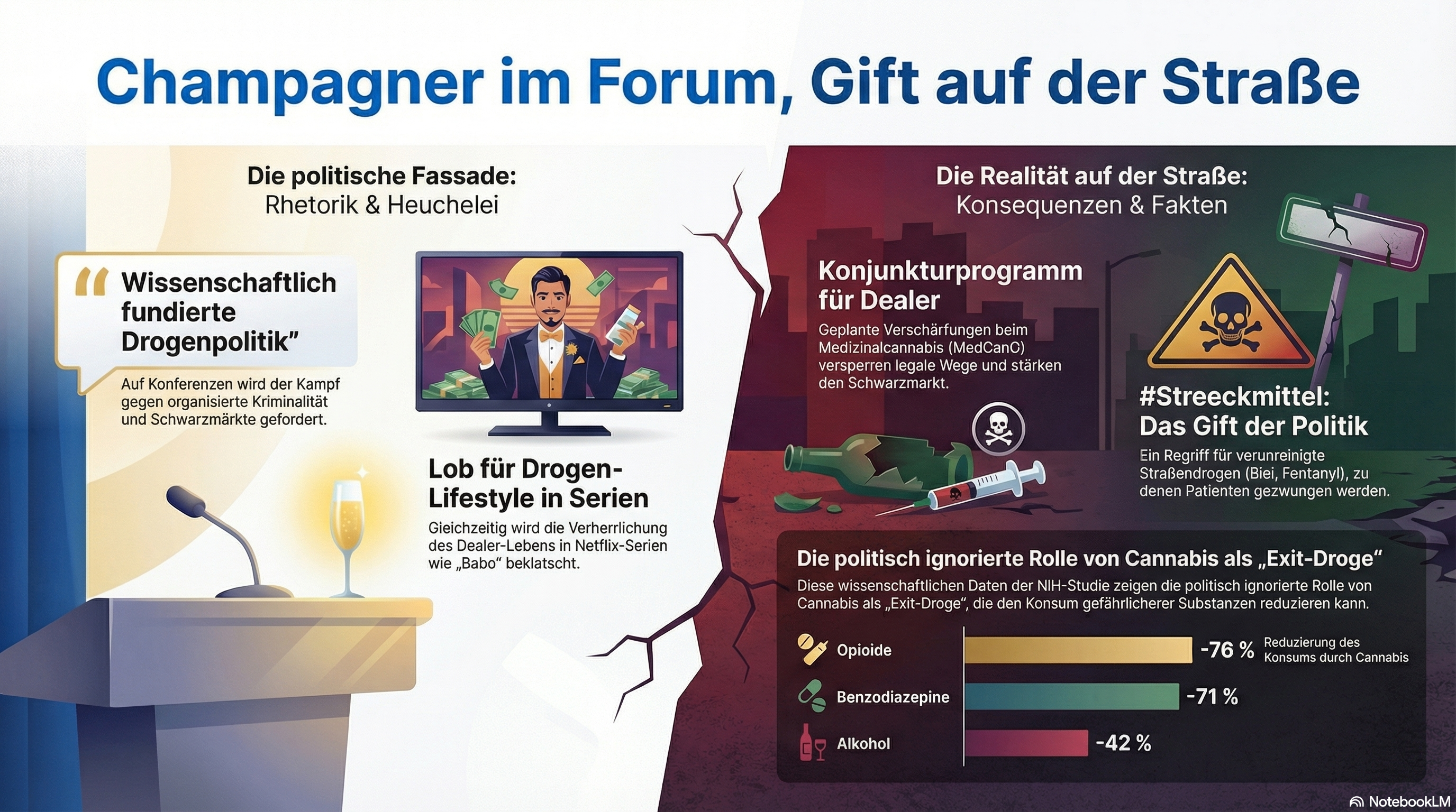 Trigger-Warnung: Dieser Artikel ist eine scharfe politische Analyse. Er kritisiert die Doppelmoral des Bundesdrogenbeauftragten und die geplante Verschärfung des MedCanG, die Patienten gefährdet.