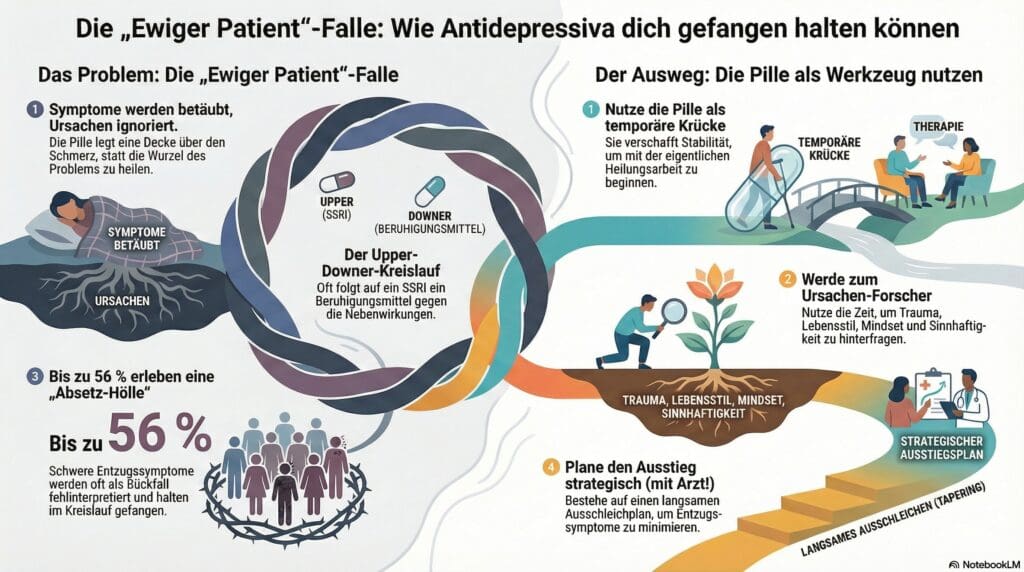 - Der Absetz-Horror: Du willst die Pille absetzen, aber die Entzugserscheinungen (Schwindel, „Brain Zaps“, Angst) sind so brutal, dass du denkst, deine „Krankheit“ kommt zurück. Du nimmst sie weiter. Du bist gefangen.