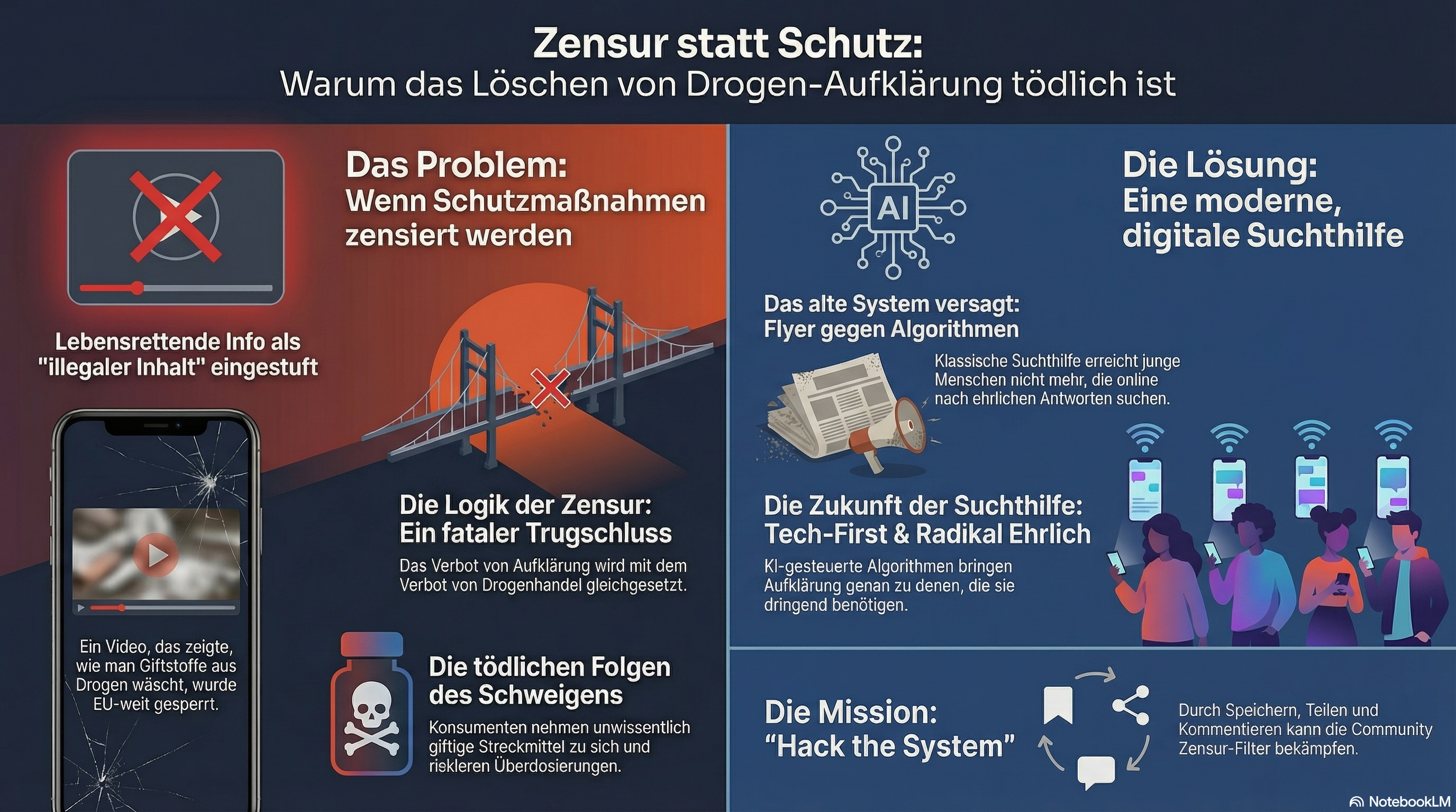 Aus dieser Konstellation erwächst ein Zielkonflikt zwischen dem Public-Health-Ansatz der Schadensminimierung (Harm Reduction) und einer Zensurlogik, die Inhalte pauschal als „illegal“ einstuft. Dieser Konflikt wird in der Sperrung eines Aufklärungsvideos des digitalen Educators „NeelixberliN“ – eines Akteurs mit langjähriger eigener Konsumerfahrung und einem Hintergrund in Neurobiologie – exemplarisch sichtbar. Sein Fall dient als kritische Fallstudie und Stresstest, der eine grundlegende Schwäche in der aktuellen Anwendung des DSA aufzeigt.