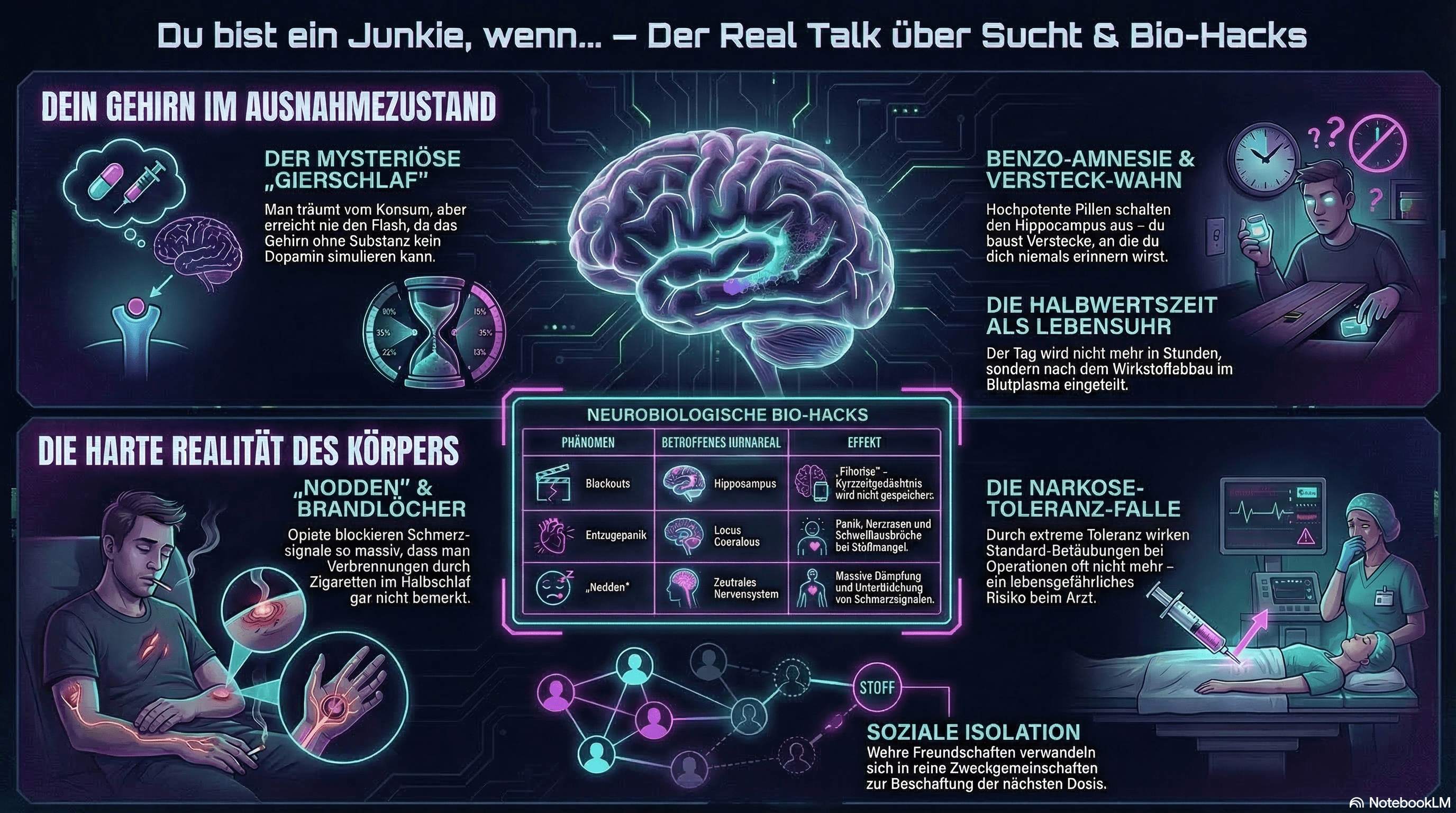 Benzo-Amnesie & Verstecke: Hochpotente Benzodiazepine schalten den Hippocampus aus. User führen komplexe Handlungen aus (wie Drogen extrem gut zu verstecken), ohne dass das Kurzzeitgedächtnis ins Langzeitgedächtnis übertragen wird.