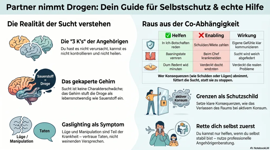 - Angehörigenberatung: Fast alle städtischen Suchtberatungsstellen bieten explizit (und kostenlos!) Termine für Partner an. Nutze dieses Angebot. Du musst dort nicht erklären, warum du noch bei ihm bist – sie kennen diese Dynamik.
