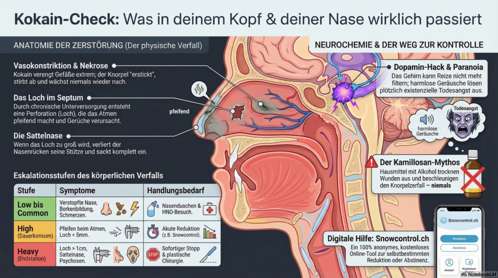 Schmeiß das Kamillosan weg. Hol dir eine Meersalz-Nasendusche. Geh zum HNO-Arzt. Und wenn du abends auf der Couch sitzt und der Frontallappen nach Dopamin schreit – logg dich bei Snowcontrol.ch ein. Hol dir die Kontrolle über deine Biologie zurück, bevor die Substanz dein Gesicht und deinen Verstand komplett frisst. Du hast das in der Hand.