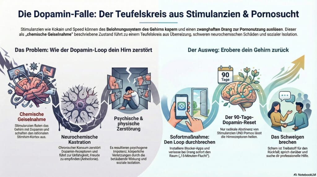 Man nennt es in der Szene „Fappen“ oder „Coke-O-Mania“. Es ist das Tabu-Thema Nummer eins. Niemand gibt im Club zu: „Ich gehe jetzt nach Hause, um mir 10 Stunden lang Pornos reinzuziehen, bis mein Körper blutet.“ Aber genau das passiert Tausenden. Wir brechen dieses Schweigen jetzt. Denn was da passiert, ist keine sexuelle Vorliebe – es ist eine chemische Geiselnahme deines Verstandes.
