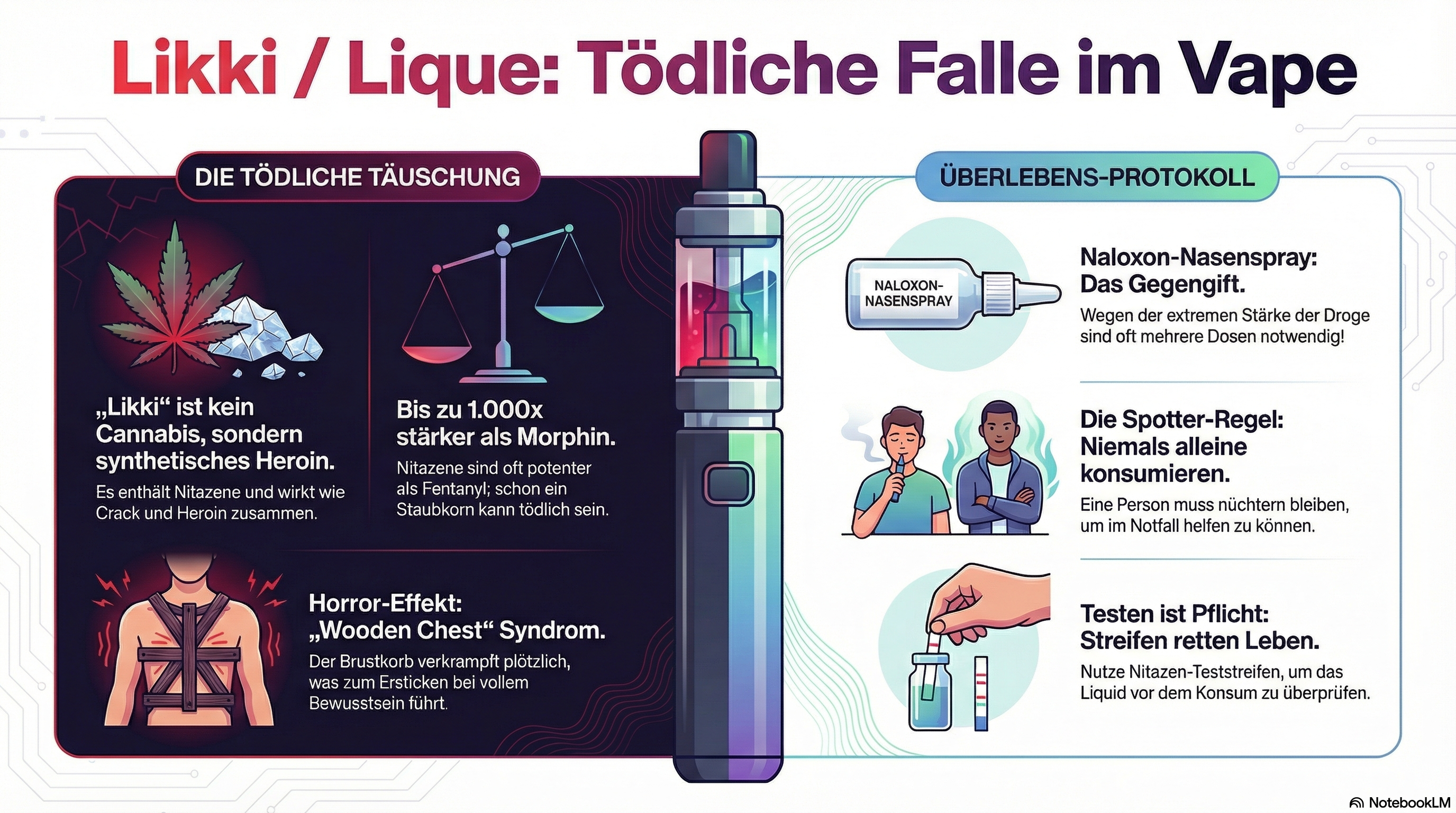 - LIKKI TYP 3 (NITAZENE) ☠️: Das ist der neue Killer. Im Vape. Wirkt euphorisierend (Rush) und dann extrem sedierend (Nodding). Gefahr: Sofortiger Atemstillstand.