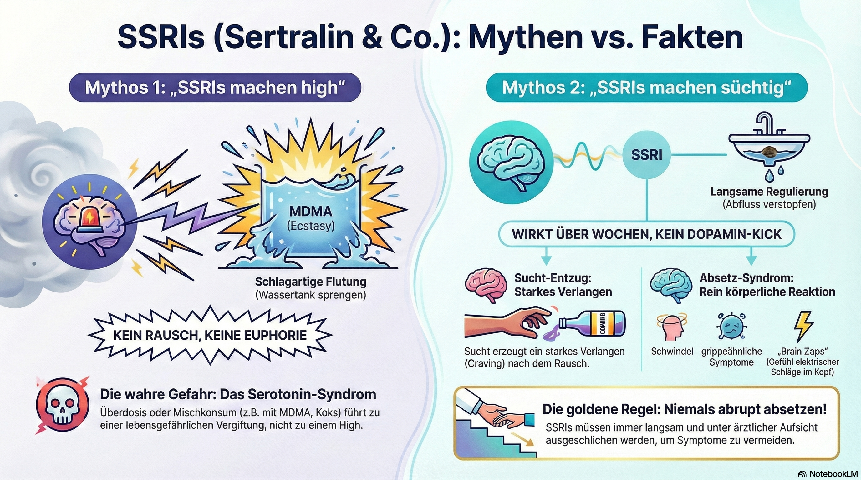 ✅ Das ist eine gefährliche Verwechslung von Symptomen. Eine massive Überdosis von SSRIs kann zum Serotonin-Syndrom führen. Dessen Symptome wie Herzrasen, Unruhe, erweiterte Pupillen und Verwirrtheit ähneln oberflächlich den negativen Nebenwirkungen eines starken Drogenrausches. Es ist aber keine Euphorie, sondern eine medizinische Vergiftung, die lebensbedrohlich ist.