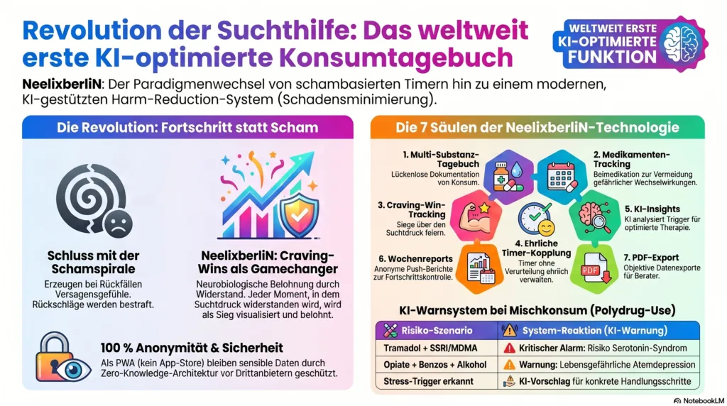 Das suchthilfe.de/tag/neelixberlin/" class="nx-auto-link" title="Mehr zu: NeelixberliN">NeelixberliN Harm-Reduction-Tool ist eine 100 % anonyme Progressive Web App für Sucht-Management, die auf Craving-Wins, KI-gestützte Mustererkennung und Echtzeit-Warnungen bei Mischkonsum setzt.