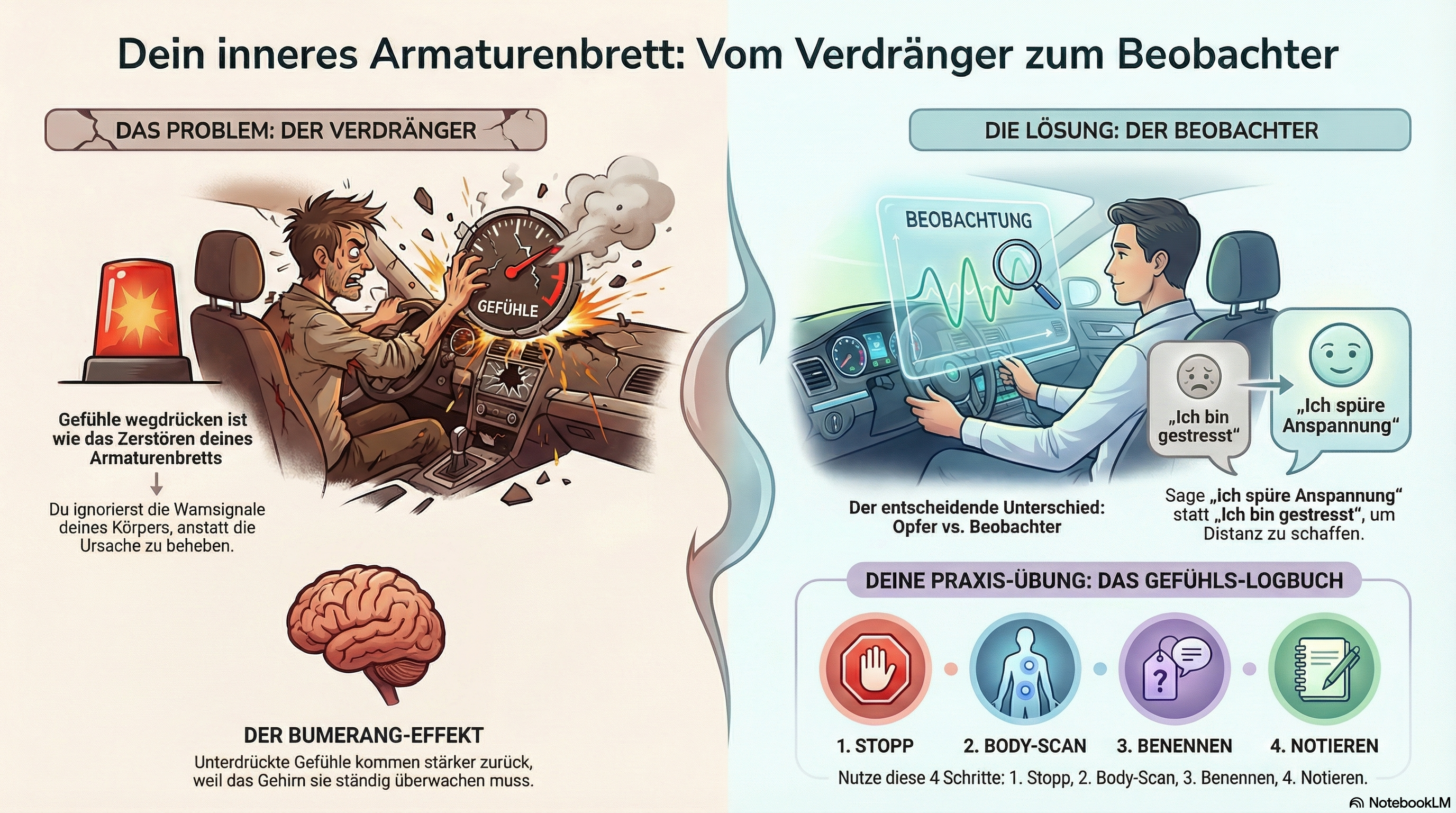 Die wichtigste Erkenntnis ist, dass du deine Gefühle nicht bekämpfen musst, um die Kontrolle zurückzugewinnen. Im Gegenteil: Erst durch die neutrale Beobachtung übernimmst du wieder die Führung. Du bist nicht länger ein blinder Passagier. Du hast gelernt, bewusst auf dein inneres Armaturenbrett zu schauen, anstatt es zu ignorieren. Diese Fähigkeit, einen Schritt zurückzutreten und zu sagen „Ich spüre“, ist der Beginn emotionaler Freiheit.