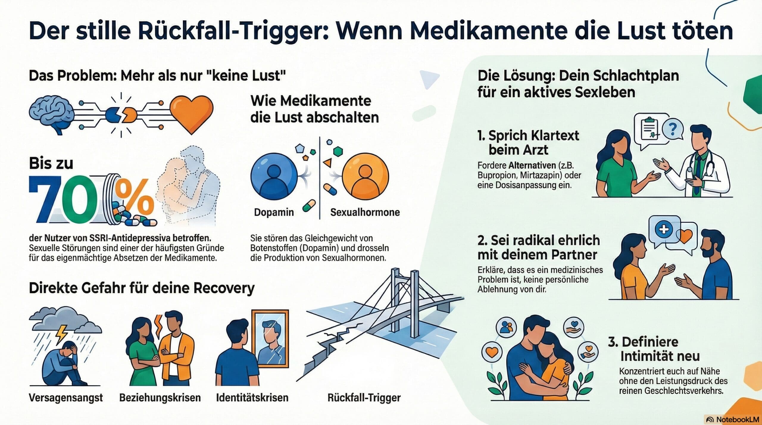 - Das Arztgespräch (unzensiert): Geh vorbereitet zum Arzt. Sage nicht „Ich hab irgendwie weniger Lust“, sondern sei direkt: „Seit ich Medikament X nehme, habe ich folgende sexuelle Nebenwirkungen: [konkret auflisten]. Das beeinträchtigt meine Lebensqualität massiv. Welche Alternativen gibt es?“