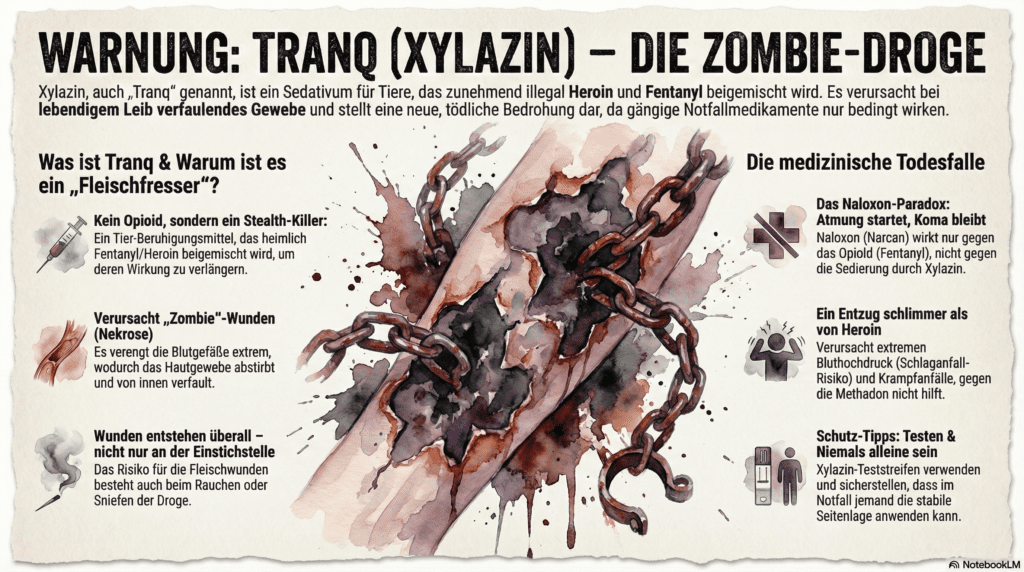 Du dachtest, Fentanyl wäre das Schlimmste, was dir auf der Straße begegnen kann? Mach dich bereit für eine neue Realität. Vielleicht hast du die Videos aus Kensington, Philadelphia, gesehen: Menschen, die mitten in der Bewegung einfrieren, den sogenannten „Tranq Walk“, umgeknickt wie leblose Figuren. Dies wird durch eine Substanz verursacht, die nicht nur tötet, sondern Konsumenten bei lebendigem Leib verfaulen lässt. Wir sprechen über Xylazin, auf der Straße bekannt als „Tranq“, „Tranq Dope“ oder „Sleep-Cut“. Es verspricht dir nicht das euphorische „Warm Blanket“-Gefühl eines Opioids; es stößt dich in einen Blackout. Was du darüber weißt, kann über dein Leben und deine Gliedmaßen entscheiden.