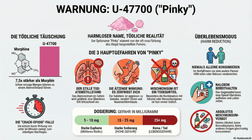 Heute reden wir über eine Substanz, die harmlos klingt wie ein Zeichentrick-Charakter, aber tötet wie ein Profi-Killer: U-47700, in der Szene oft „Pinky“ oder „U4“ genannt.