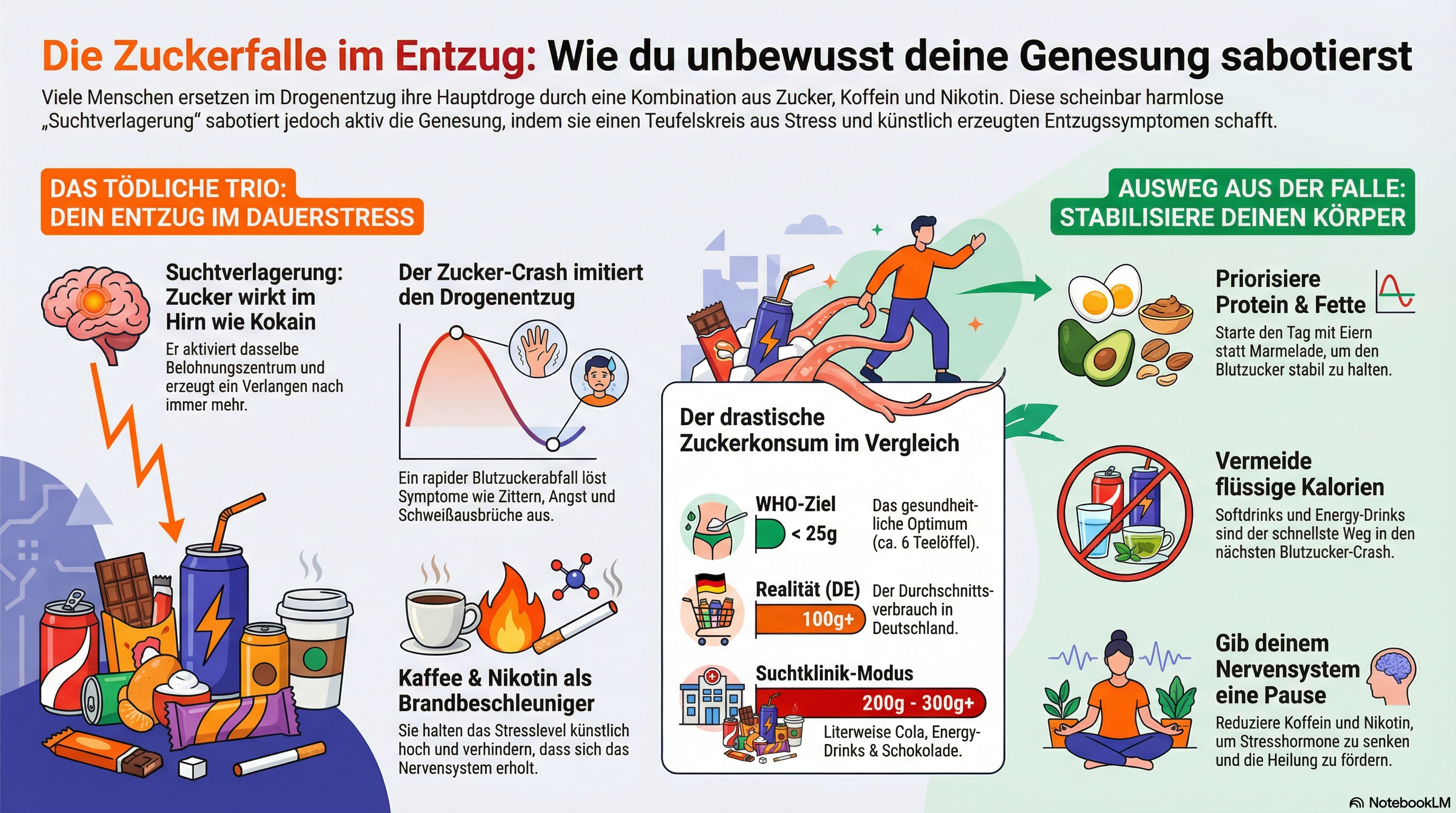 - [Tödliches Trio]: Die Kombination aus Zucker, Koffein und Nikotin hält das Stresslevel (Cortisol) im Entzug künstlich oben und verhindert echte Erholung.